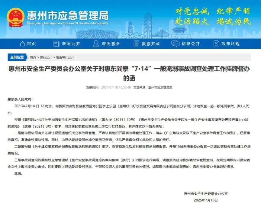 据惠州市应急管理局消息苏州股票配资公司,7月14日12时许,惠州市惠东县巽寮滨海旅游度假区海公园水上乐园(惠州好山好水旅游发展有限责任公司惠东分公司)泳池发生一起一般淹溺事故,致1人死亡。